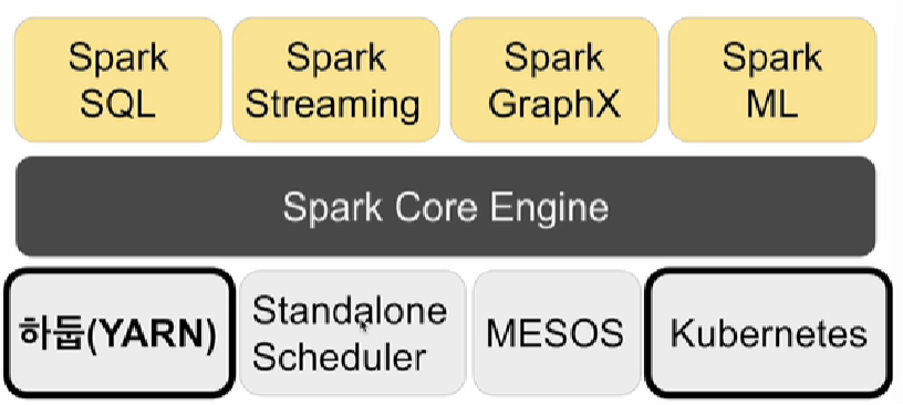 - Spark은 하둡(Yarn)이외에도 다른 분산 컴퓨팅 환경 지원(K8s, Mesos)